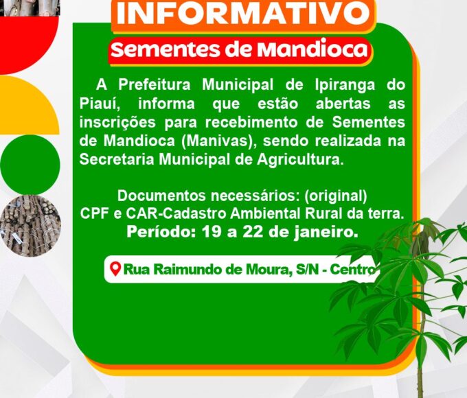 Byevanilsonoutubro 8, 2025Atenção, produtores rurais de Ipiranga do Piauí! A Prefeitura Municipal informa que estão abertas as inscrições para o recebimento de sementes de mandioca...