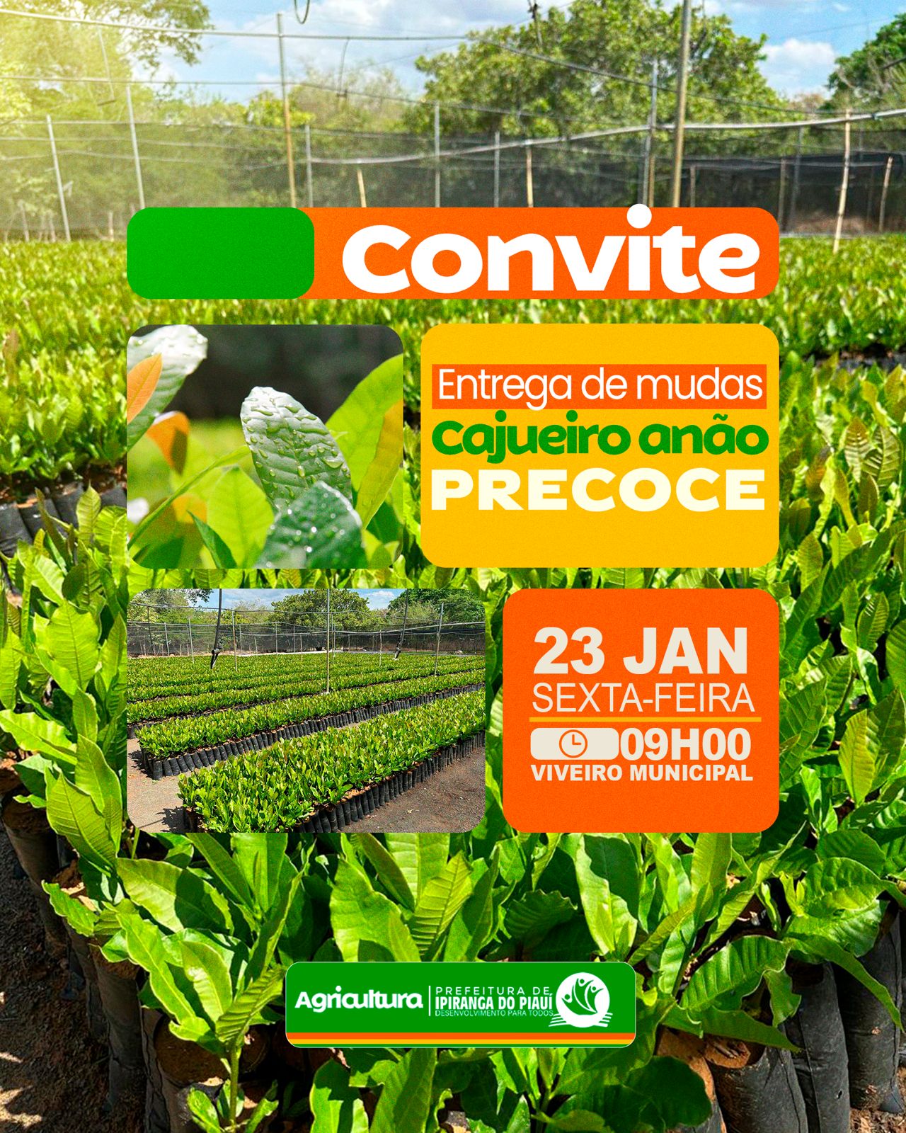 por meio da Secretaria Municipal de Agricultura, convida você para a entrega de mudas de cajueiro anão precoce.