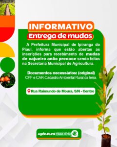 A Prefeitura de Ipiranga do Piauí informa que estão abertas as inscrições para o recebimento de mudas de cajueiro anão precoce.