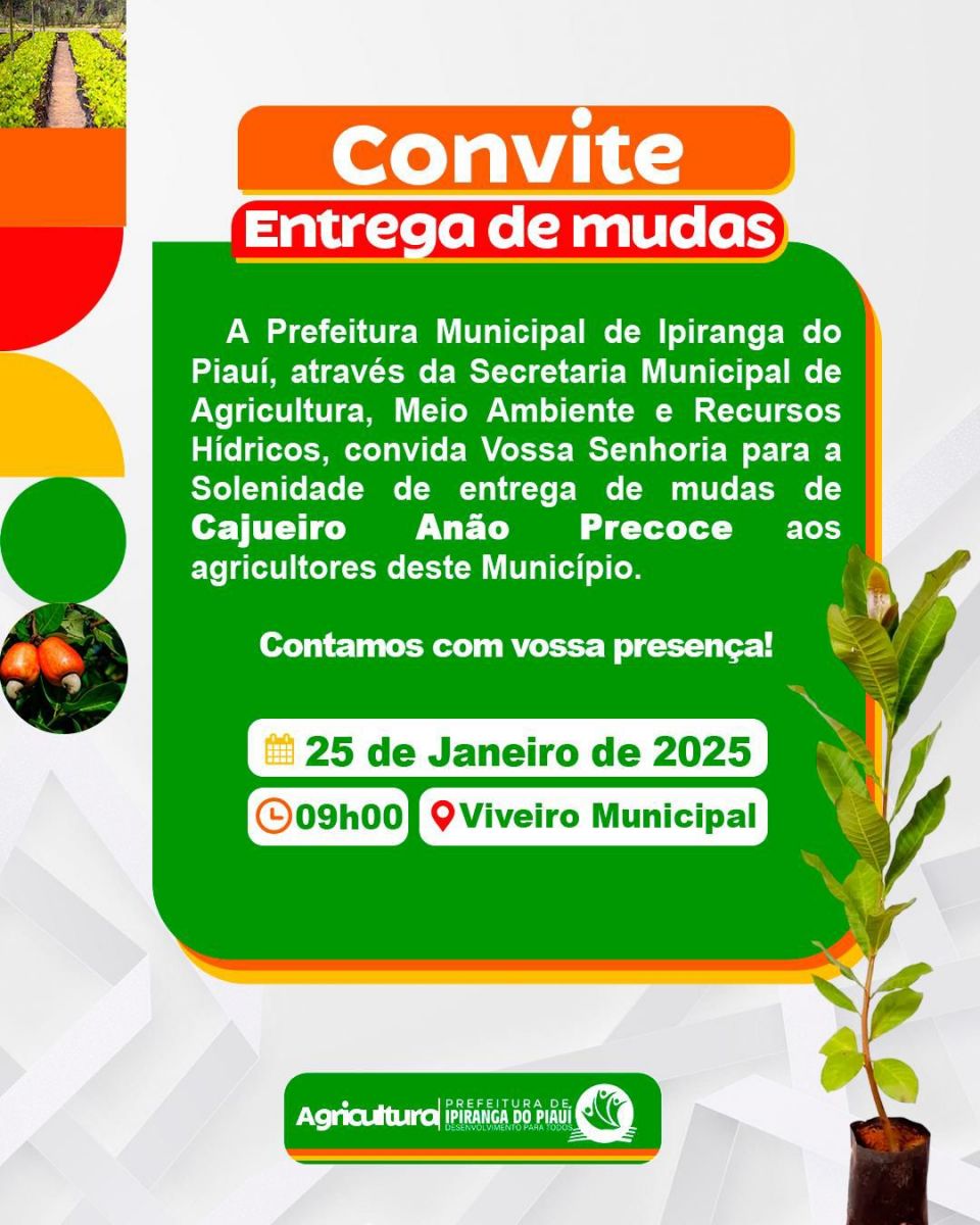 A Prefeitura de Ipiranga do Piauí, por meio da Secretaria Municipal de Agricultura, Meio Ambiente e Recursos Hídricos, está convidando todos os agricultores devidamente cadastrados para participarem da distribuição de mudas de cajueiro anão precoce enxertado.