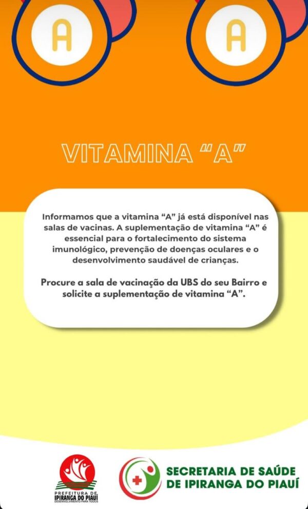 VITAMINA “A” Informamos que a vitamina “a” já está disponivel nas salas de vacinas. a suplementação de vitamina “a” é essencial para o...