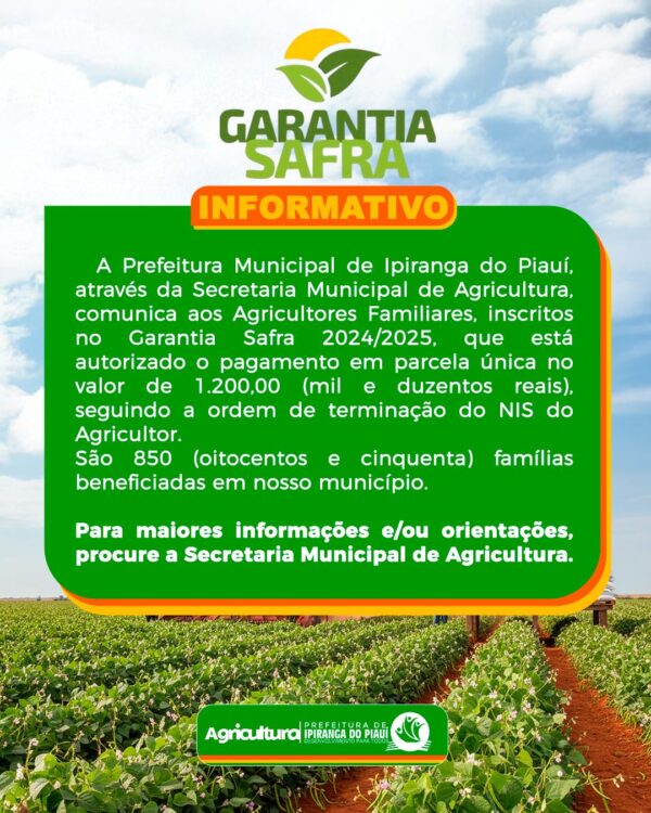 Byevanilsonmarço 20, 2026GARANTIA SAFRA 2025/2026 A prefeitura Municipal de Ipiranga, através da Secretaria Municipal de Agricultura, informa aos Agricultores cadastrados no Garantia Safra, que os...