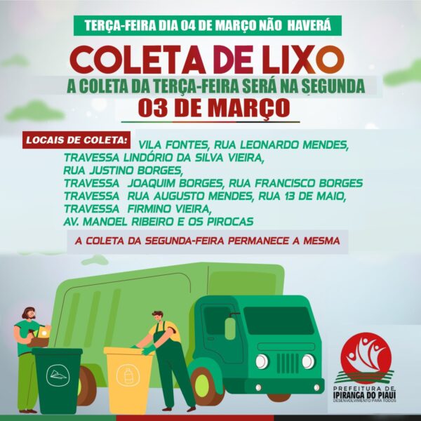 Byevanilsonmarço 18, 2025Terça-Feira dia 04 de Março Não Havera coleta de Lixo A coleta da Terça-Feira será na segunda dia 03 de MArço Locais de...
