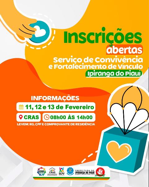 Byadminfevereiro 15, 2025A Prefeitura de Ipiranga do Piauí, por meio da Secretaria Municipal de Assistência Social, está com inscrições abertas para o Serviço de Convivência e...