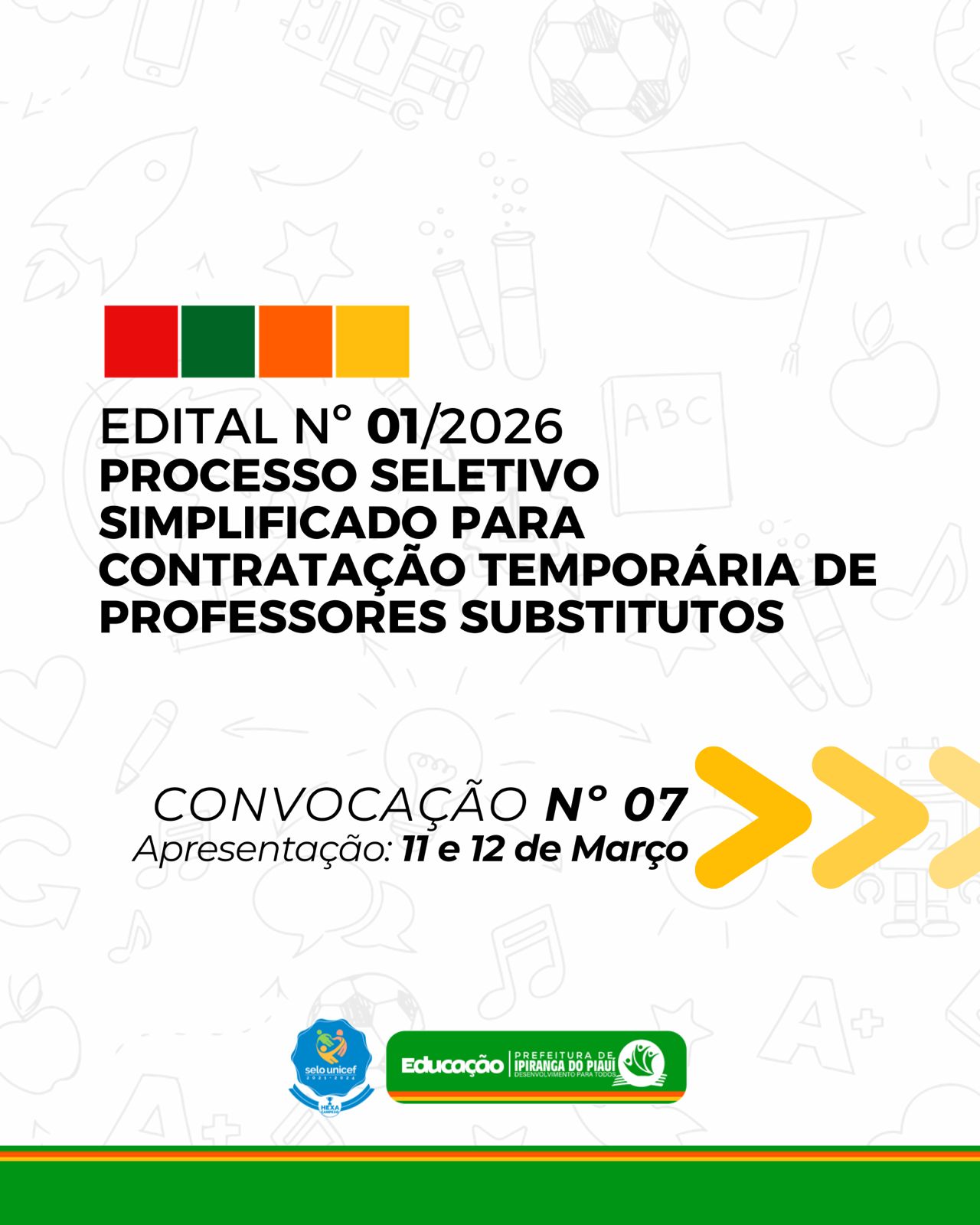 Lar Secretarias Educação EDITAL Nº 01/2026 PROCESSO SELETIVO SIMPLIFICADO PARA CONTRATAÇÃO TEMPORÁRIA DE PROFESSORES SUBSTITUTOS CONVOCAÇÃO Nº 07 APRESENTAÇÃO 11 E 12 DE MARÇO