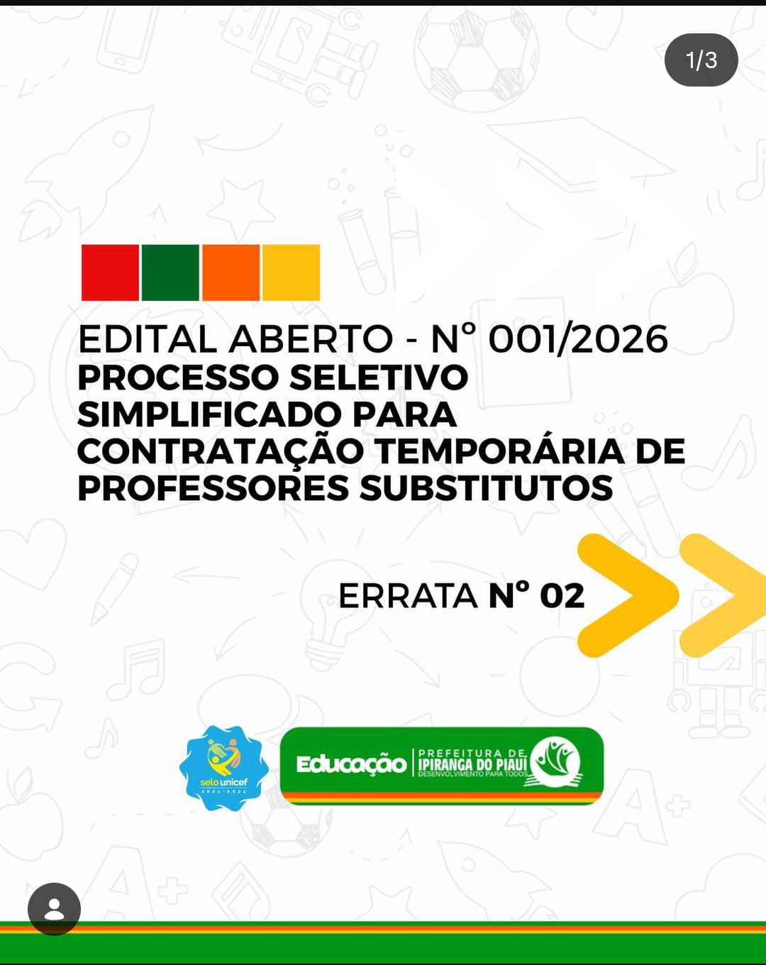 Lar Secretarias Educação EDITAL ABERTO – N 001/2026 PROCESSO SELETIVO SIMPLIFICADO PARA CONTRATAÇÃO TEMPORÁRIA DE PROFESSORES SUBSTITUTOS ERRATA Nº2