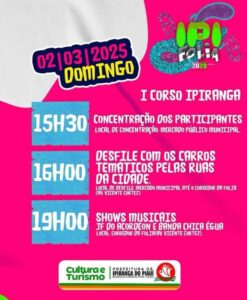 A Prefeitura de Ipiranga do Piauí, por meio da Secretaria de Cultura e Turismo, e com o apoio do prefeito Elvis Ramos, dará início neste domingo, 02 de fevereiro, ao Ipi Folia, evento carnavalesco que entra para o calendário festivo da cidade.
