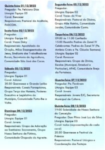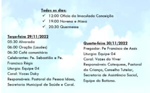 Conforme a programação, diariamente, até o dia 07 de dezembro, é rezado o Ofício da Imaculada Conceição ao meio dia e às 19h acontece a novena e missa, seguida da quermesse. Hoje, a primeira noite de missa, será presidida pelo padre Sebastião Santos. No dia 08 de dezembro, quando a igreja celebra a festa de N. S. da Conceição, às 19h, acontecerá a missa solene.