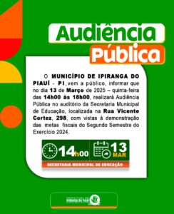 O Município de Ipiranga do Piauí convida toda a população para a Audiência Pública que acontecerá no dia 13 de março de 2025, às 14h, no auditório da Secretaria Municipal de Educação.